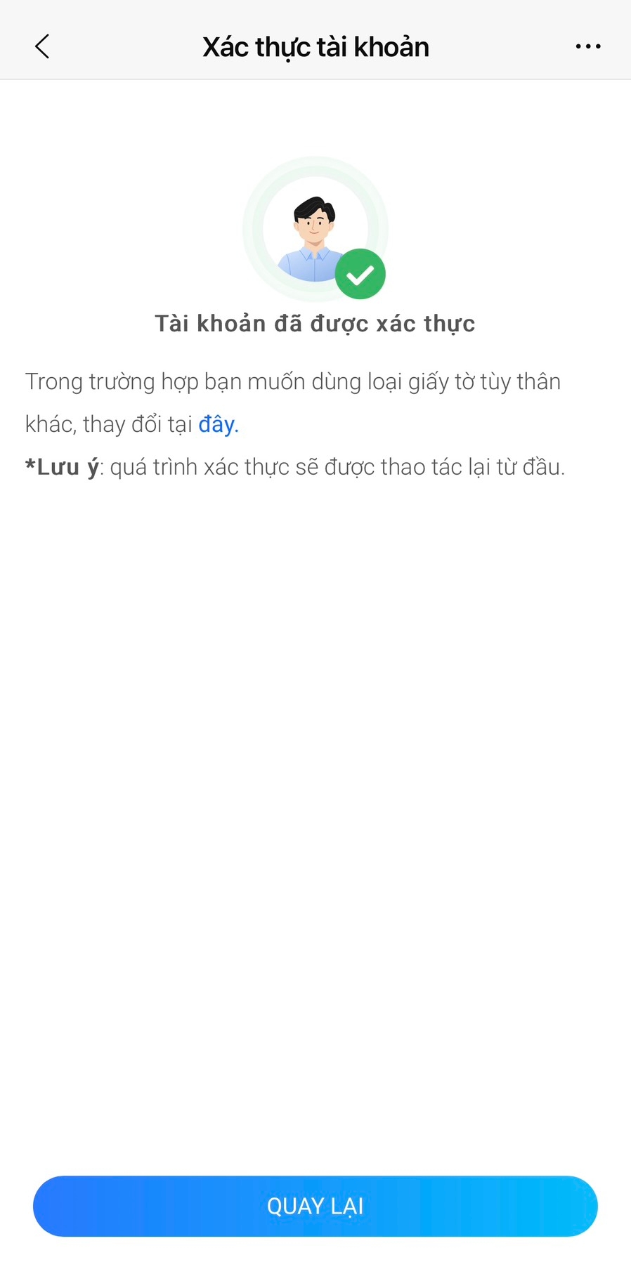 Sau khi hoàn tất xác thực tài khoản, người dùng vào mục Cá nhân >> chọn Tài khoản và bảo mật >> Nhấn vào mục Xác thực tài khoản. Nếu tài khoản đã được xác thực, hệ thống sẽ hiện thông báo như dưới đây.
