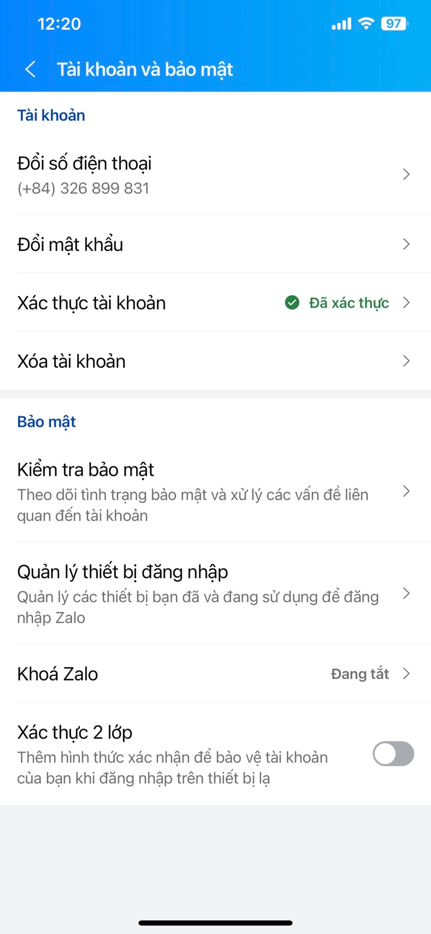 Cách 2: Xác thực tài khoản Zalo trực tiếp trên app Zalo. Tại phần Cá nhân, nhà quảng cáo chọn Tài khoản và Bảo mật và chọn Xác thực tài khoản.